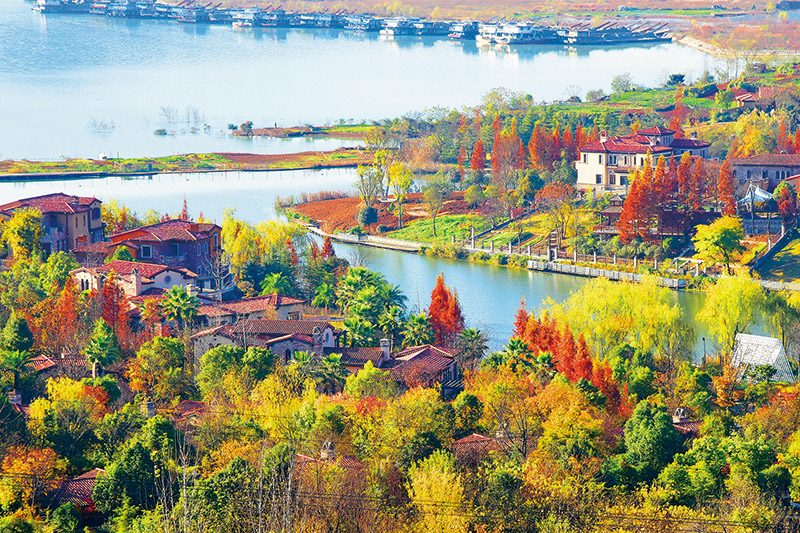 作为南水北调中线工程水源区,近年来湖北省十堰市大力开展“生态乡村”、“美丽村落”建设,加大植树造林力度,生态建设取得积极成效。图为2021年11月24日拍摄的十堰市郧阳岛初冬景色。 人民图片 杨显有/摄