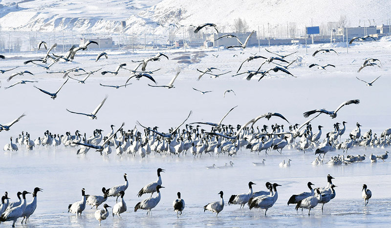 近年来,西藏自治区多措并举实施生态建设工程,生物多样性保护取得明显成效,国家一级保护动物黑颈鹤数量逐年递增。图为2022年2月22日,在拉萨市林周县境内拍摄的黑颈鹤。 新华社记者 姜帆/摄