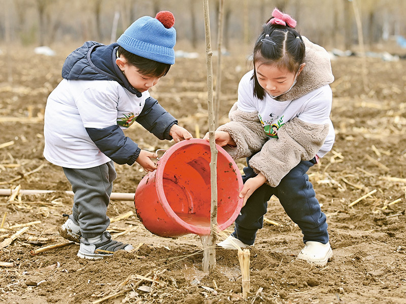 2022年3月12日,在北京第五季龙水凤港生态农场,小朋友在公益植树活动上为树苗浇水。 新华社记者 李贺/摄