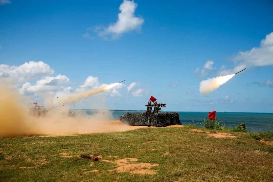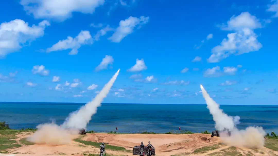 “搜索目标、截获、解锁,预备——放!”,粤西海滨,烈日炎炎,随着阵地指挥员一声令下,数枚导弹呼啸而出、划破天际精准命中靶机。